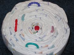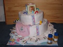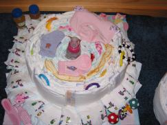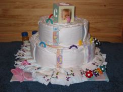 Cake bottom: cloth-covered board, 21 diapers, 2 bottles fruit juice,
