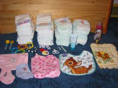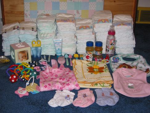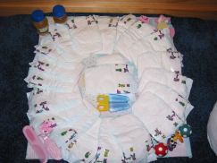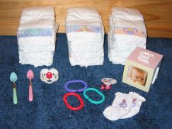 Second layer: 40 diapers, 2 bibs, 2 pair socks, 2 pillow cases, 6 toy rings,