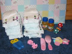 Top layer: Photo box, 31 diapers, 3 toy rings, 2 spoons, 1 nuk, 1 nuk holder,